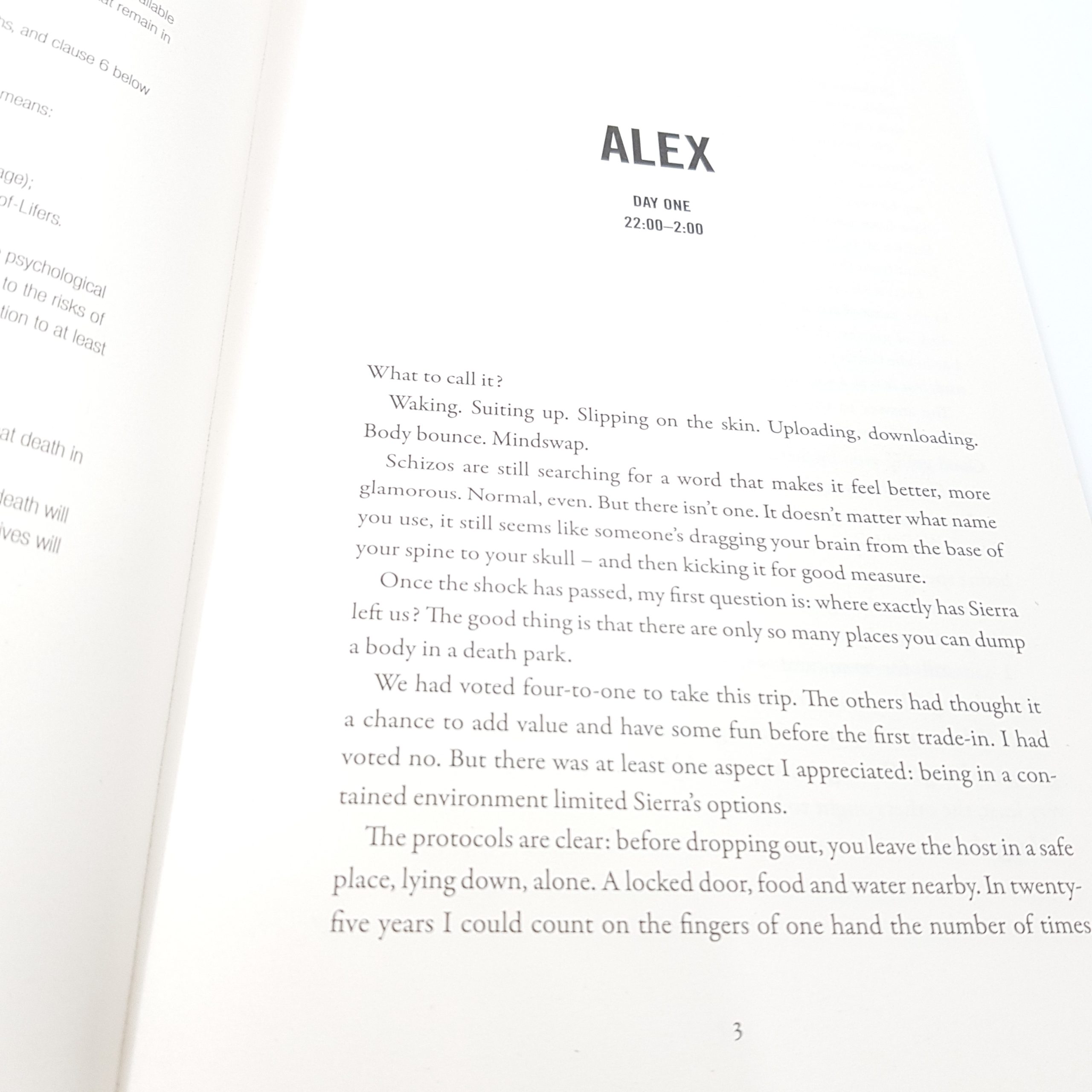 Alex, Kate, Sierra, Ben and Mike are a commune. They have already spent twenty-five years together, arguing, reconciling, alliances shifting and re-forming. They travel to a Death Park where games are played in which extra lifespan can be gambled like money. The plan is to win time to upgrade their next host body. But then Kate accepts a dangerous offer, and one of them disappears.