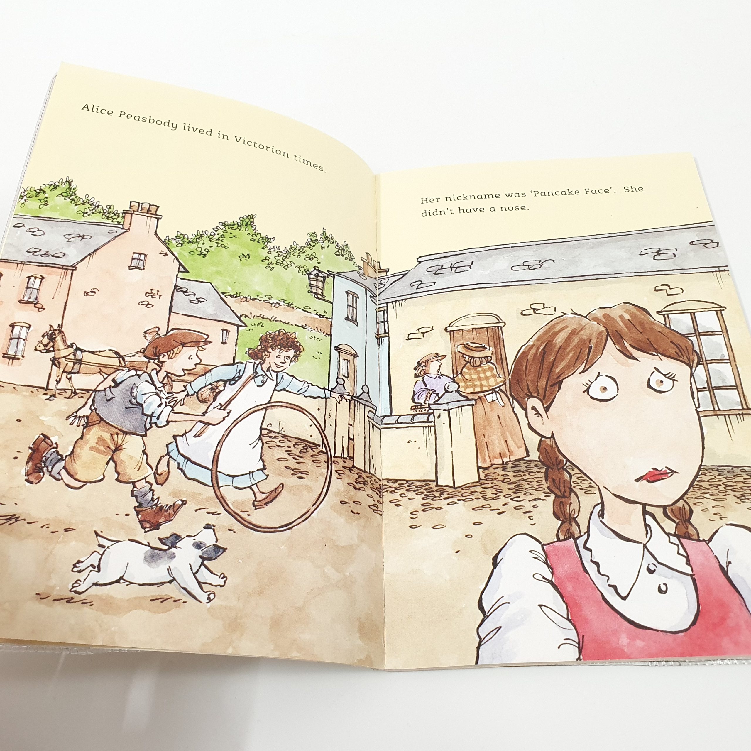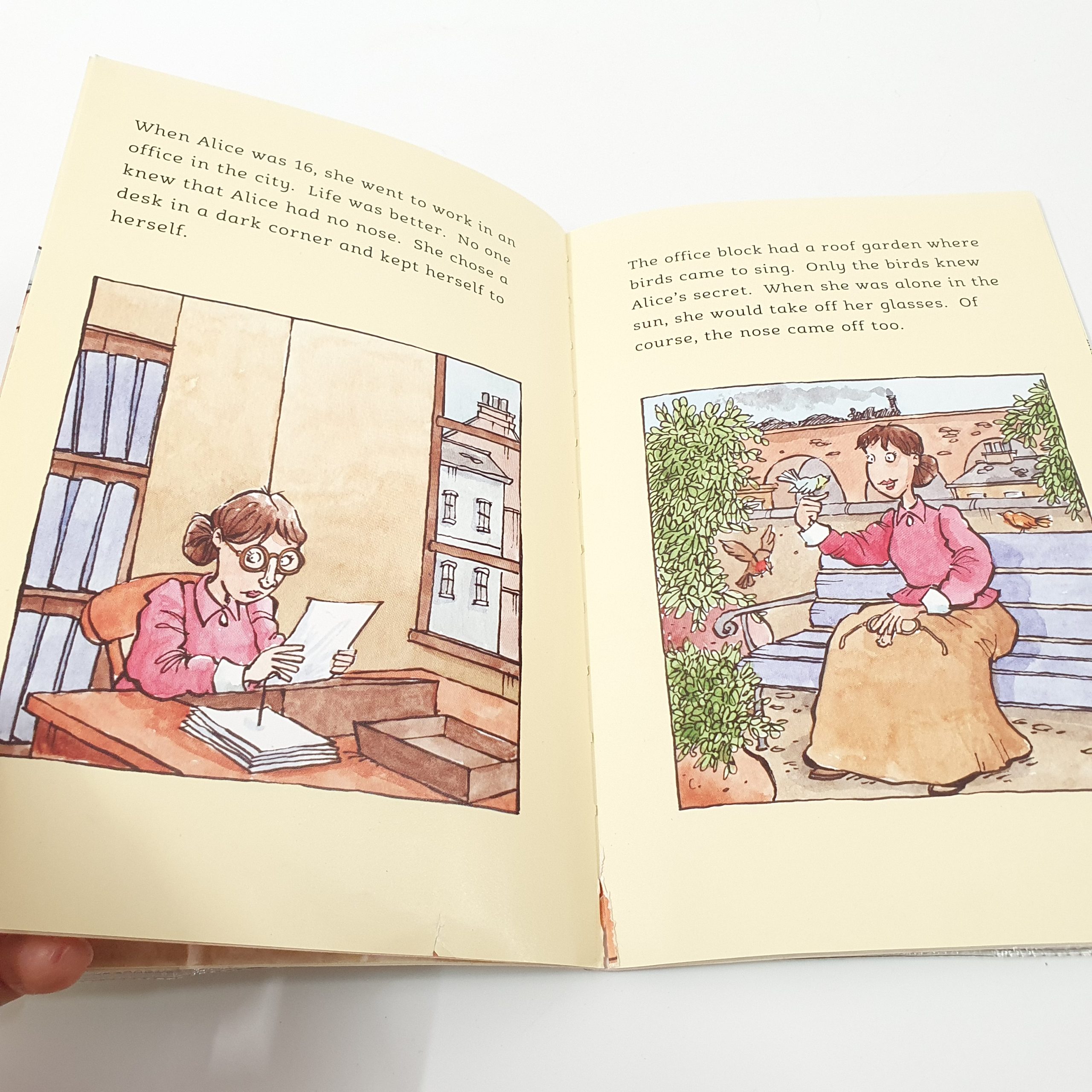 Alice Peasbody has no nose. People point and stare. Only the birds in the garden are Alice’s friends. She tries to hide away, but it’s hard to hide a pancake face for ever โฆ